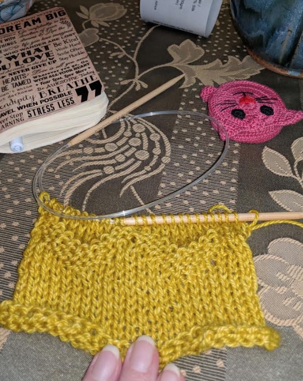 I added some garter rows. I'll do a bit more (and a few more garter rows) before I start the crown decreases. The yarn is so soft and warm (I did try it on my head and it fits - yay!!). I just need to Finish it.